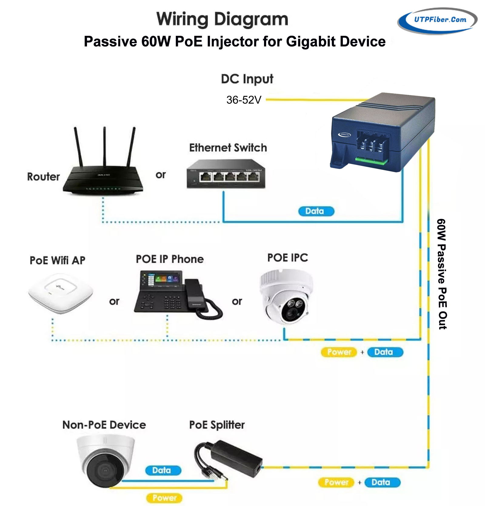 36-52VDC Powered 10/100/1000Mbps 60W Passive POE Injector |