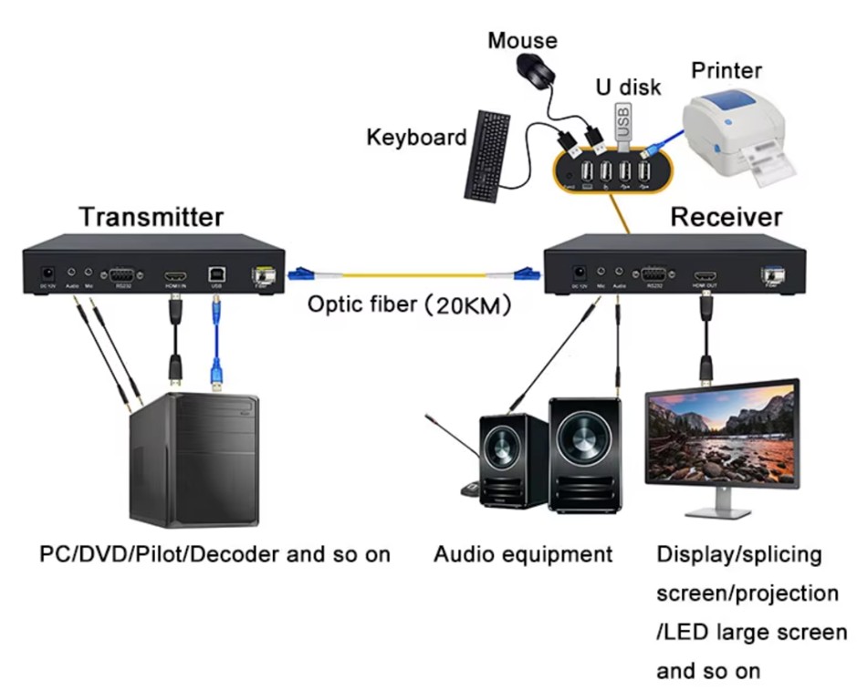 | UF-HKF1A1M1K1D | 4K HDMI Fiber Optic Converter: 1Ch 4K 30Hz HDMI+1Ch Forward Audio+1Ch Backward Mic+1Ch KVM USB+1Ch Backward RS232, Single Mode, Single Fiber LC 20KM, including Transmitter and Receiver, used by pairs |