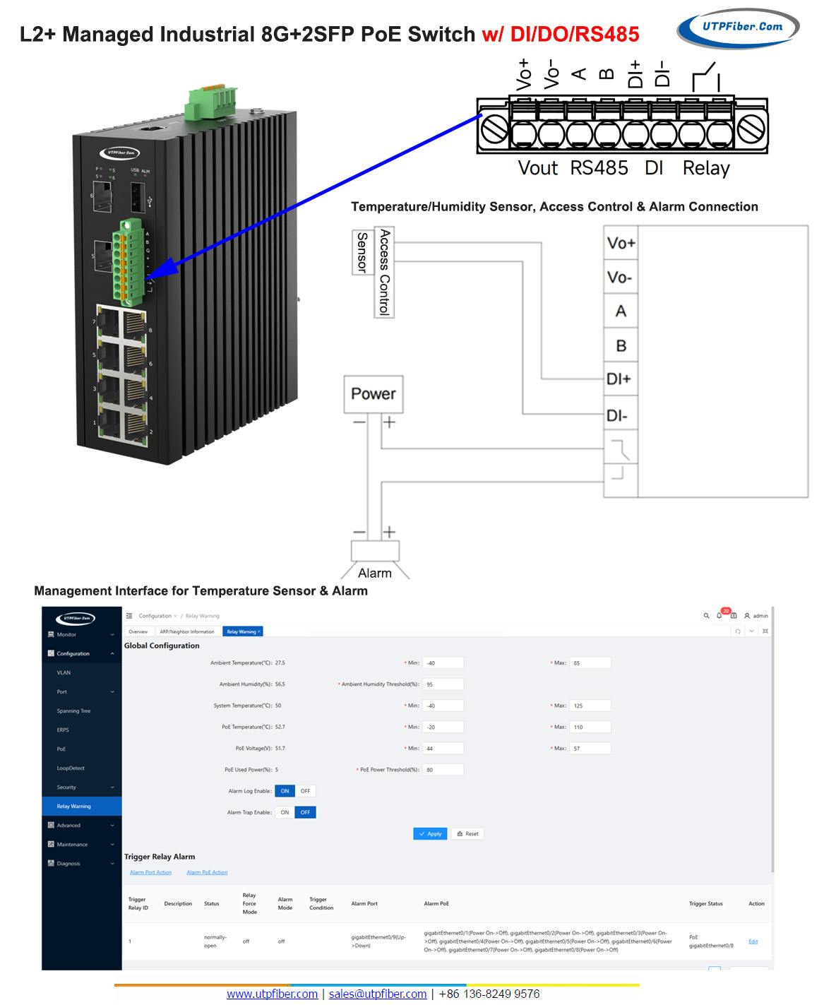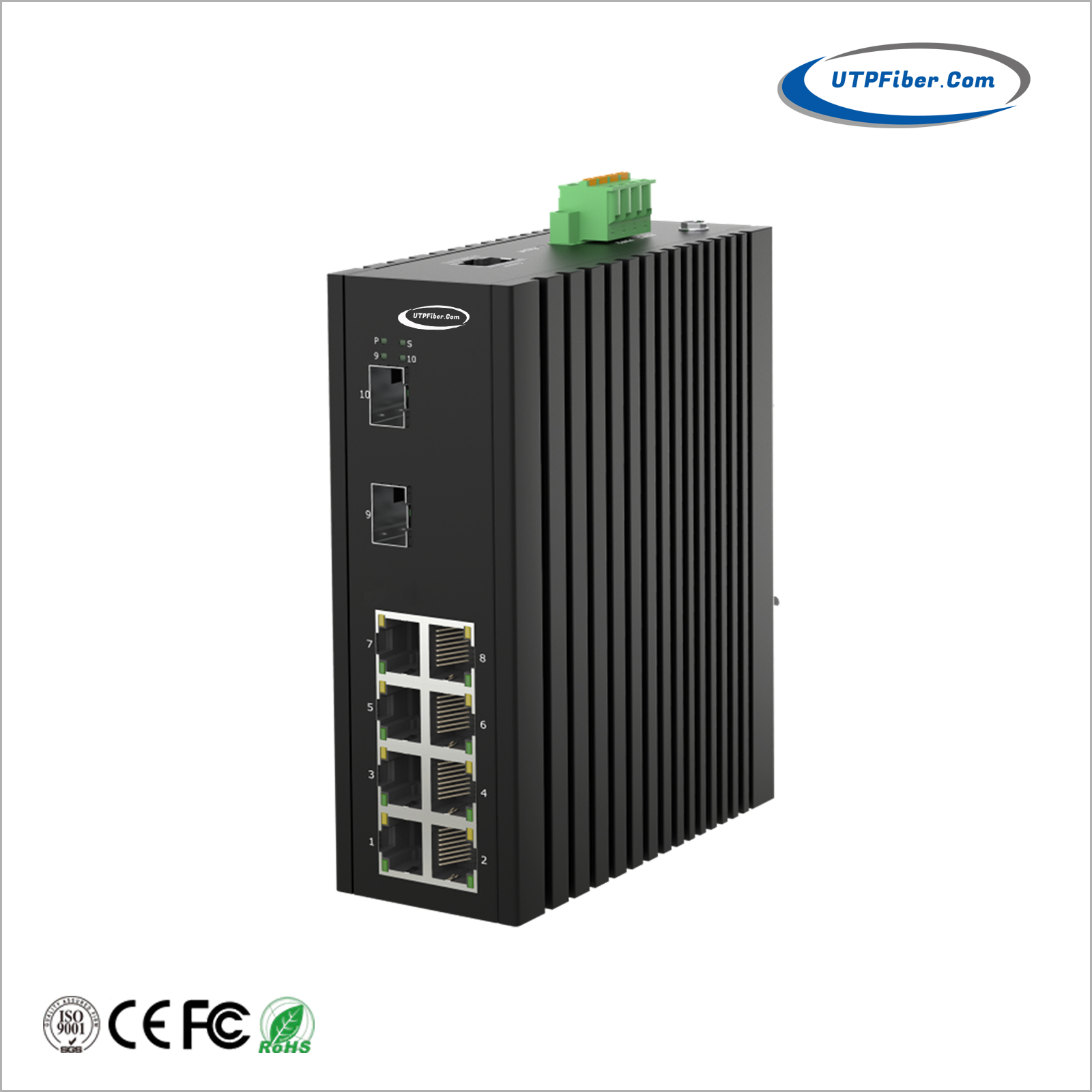 The UTP UF-MIS6208GP-SFP series are the highly reliable managed industrial PoE switches with 8-port 10/100/1000-T PoE and 2-port 1000/2500Base-X fiber optical interfaces. They comply with IEEE802.3af, IEEE802.3at standard PoE protocol, the Max power consumption can reach 30W (PoE+) per port. They support ERPS redundant network and the self-recovery mechanism is less than 20ms on full load which allows you to scheme a reliable Ethernet network by building a redundant ring topology as your back-up solution. UF-MIS6208DGP-SFP series also support DI/DO/RS485 and robust layer 2 management function, which can fulfill the special needs of industrial automation applications.