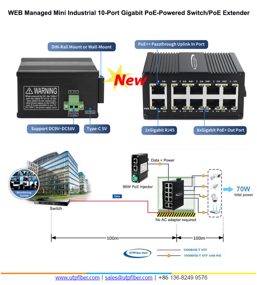 WEB Managed DIN-Rail Mini Industrial 10-Port Gigabit PoE-Powered Switch/PoE Extender: 1 x Gigabit PoE++ input port, 1 x Gigabit Ethernet output port, 8 x Gigabit PoE+ output ports |