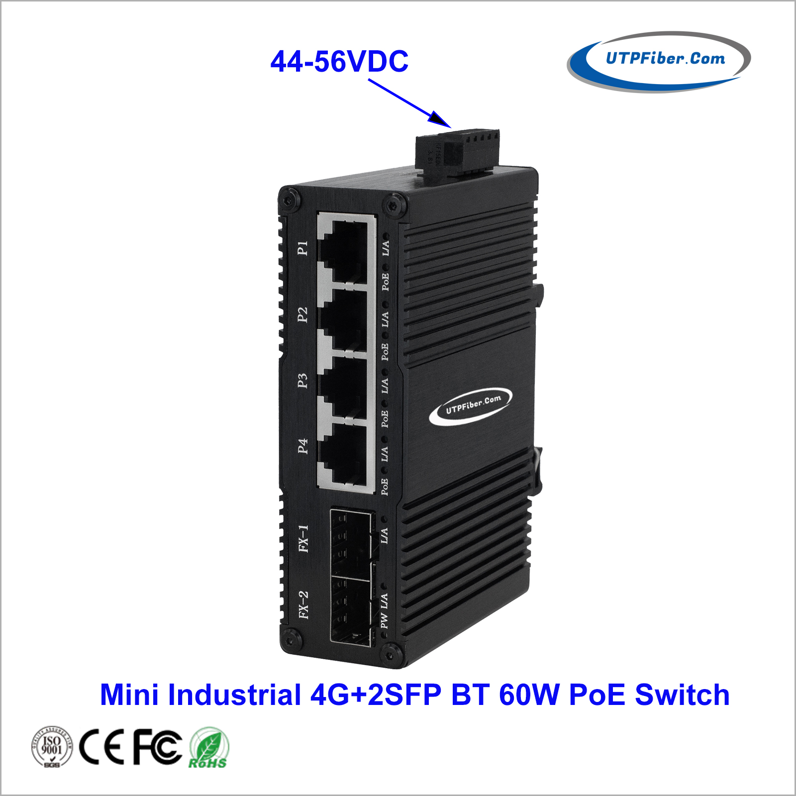 Mini Industrial 4-Port 10/100/1000T 802.3bt PoE 60W + 2-Port 100/1000X SFP Gigabit Ethernet Switch |
