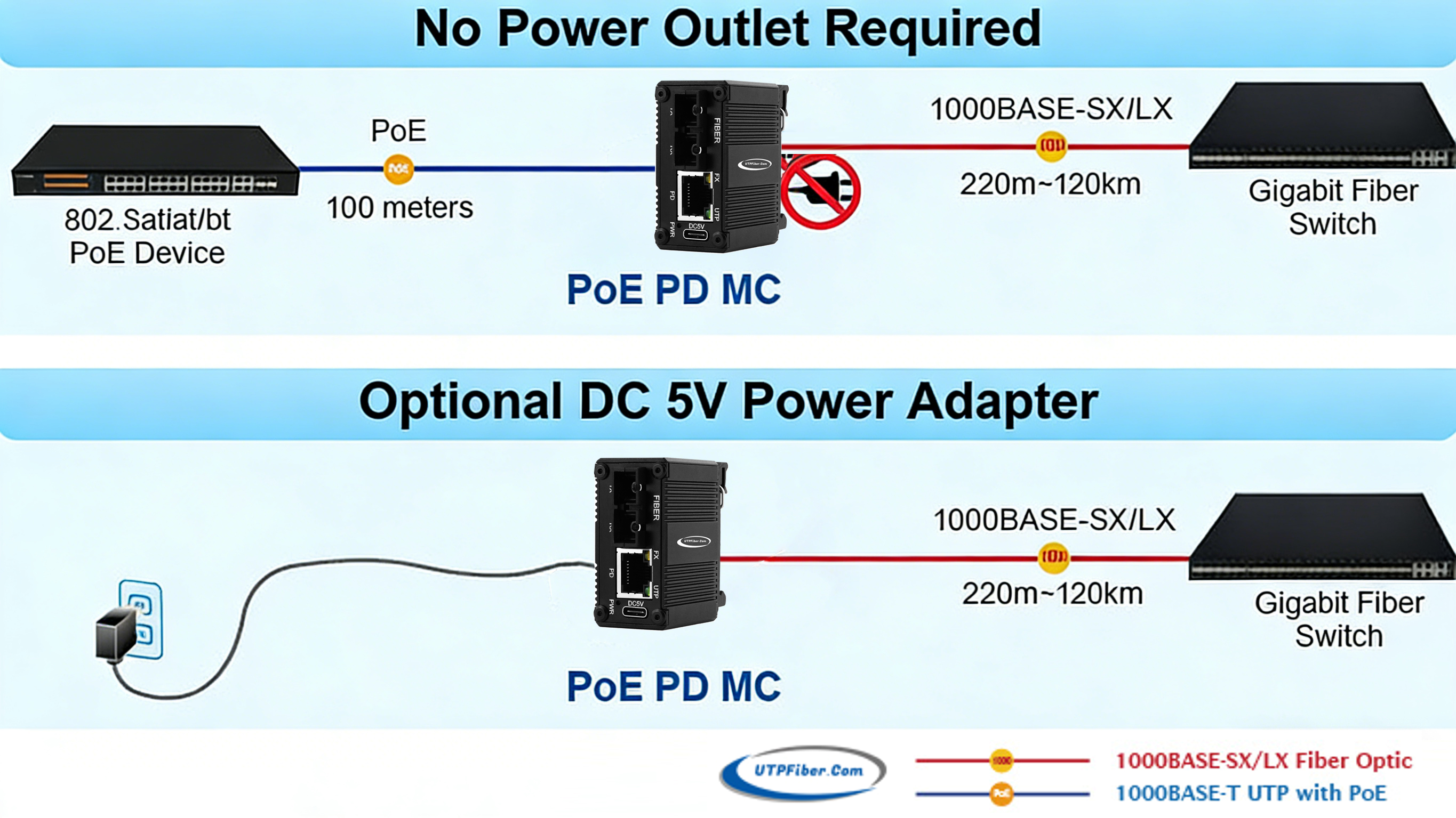Eliminates the need for a local power outlet. The UF-IS3011PD-LFP is a game-changing Micro Mini Industrial Gigabit Media Converter designed for ultra-flexible deployment in harsh and remote environments. By integrating advanced PoE PD (Powered Device) technology, this converter can be powered directly through the Ethernet cable from a PoE switch or injector (supporting IEEE 802.3af/at/bt standards), making it the "lifesaver" for installations on outdoor poles, ceilings, or space-constrained cabinets where power outlets are unavailable.