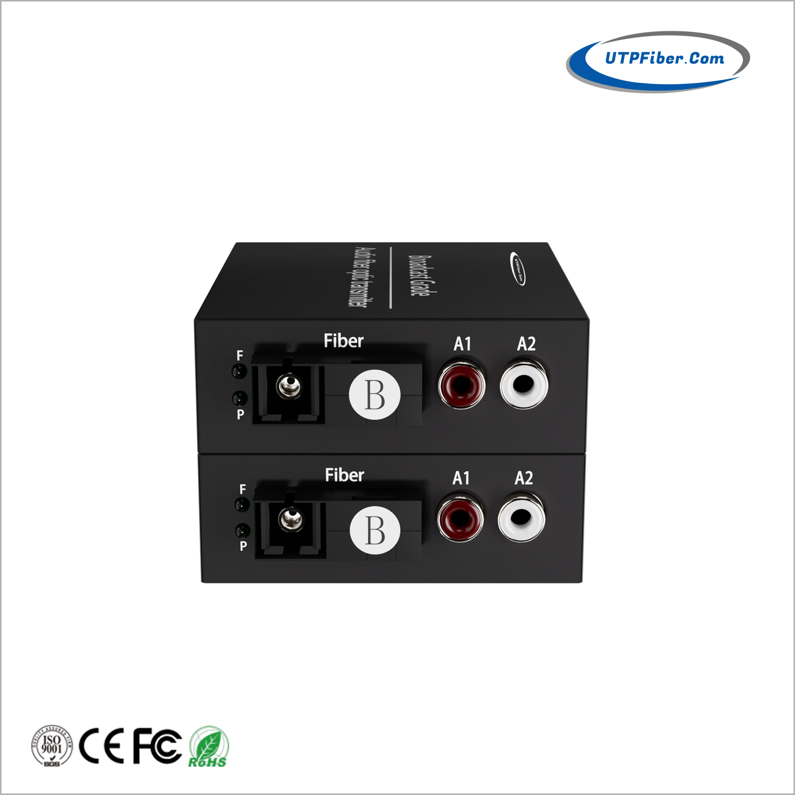 UTP’s RCA L/R stereo / mono audio extender transmits analog stereo audio signals up to 20 km using a single mode (SM) fiber cable strand over 1310/1550 nm.