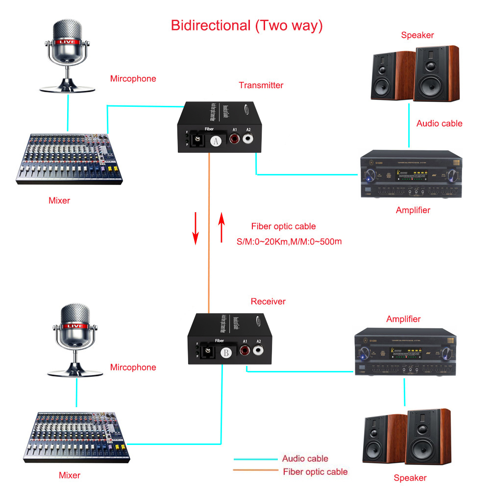 Each set consists of two units, one on the transmitter side, and one on the receiver side, that can be connected to an RCA analog stereo audio source and RCA stereo audio speakers or receiver, or 1-Channel Bi-Directional separate mono RCA can be sent over the fiber independently.