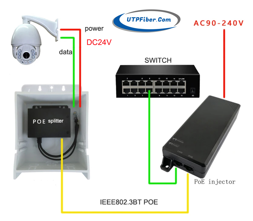 The PoE splitter, output voltage of 24V use with the power supply equipment, It helps to expand wireless city, Security monitoring and other PoE practical place, and is not restricted by layout of power line.