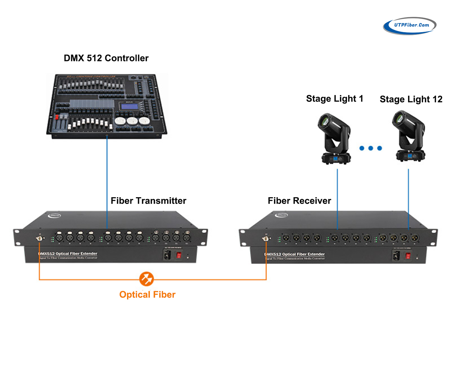 The UF-DMX12KN series 12-Channel XLR DMX512 Fiber Optic Converter is the professional-grade solution for connecting remote lighting equipment to a DMX512 control console through high-performance fiber optic cabling. Consisting of a dedicated Transmitter (Console Side) and Receiver (Lighting Side), the system utilizes optical fiber as a transmission medium to significantly enhance system performance and extend signal reach far beyond traditional copper limitations. While the electric interface supports standard DMX512 distances exceeding 100 meters, the optical interface supports up to 2km on multi-mode fiber and 20km–100km on single-mode fiber.