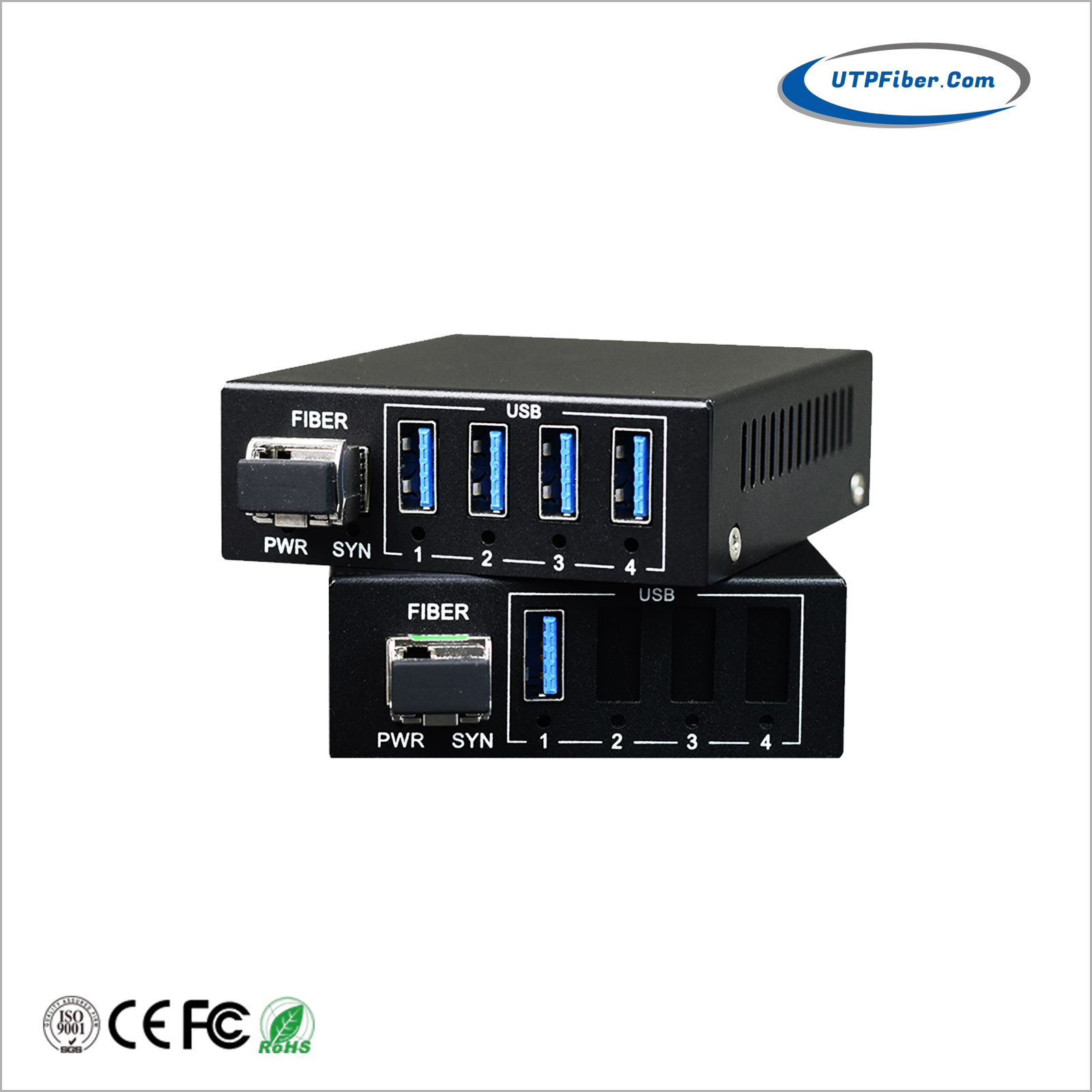 The UF-F4USB321-T/R USB3.0/USB2.0/USB1.1 Fiber Optical Extender consists of a transmitter and a receiver, which extends the USB interface (USB3.0) of the host computer to the remote end and expands it to 4 USB ports through single-mode or OM3 multi-mode optical fiber. Maximum transmission distance is 200m (single mode fiber).
