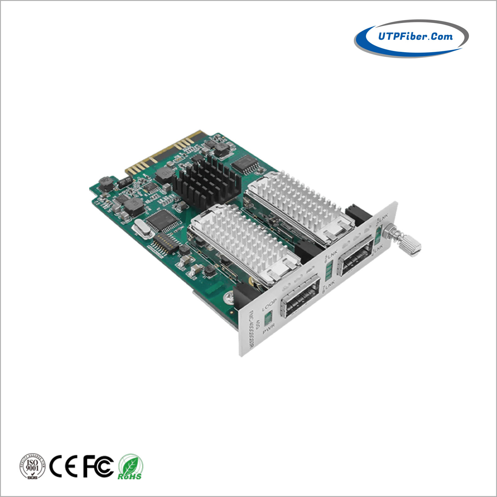 AccessoriesUTP UF-MC40G-3R provides media conversion and distance extension for 40G or 10G Ethernet links. It is hot-swappable with two QSFP sockets for QSFP transceivers. Installation and setup is simple plug and play. Insert the module into any powered Fiber Driver chassis with the QSFP transceivers required for the application, and then connect to the network.