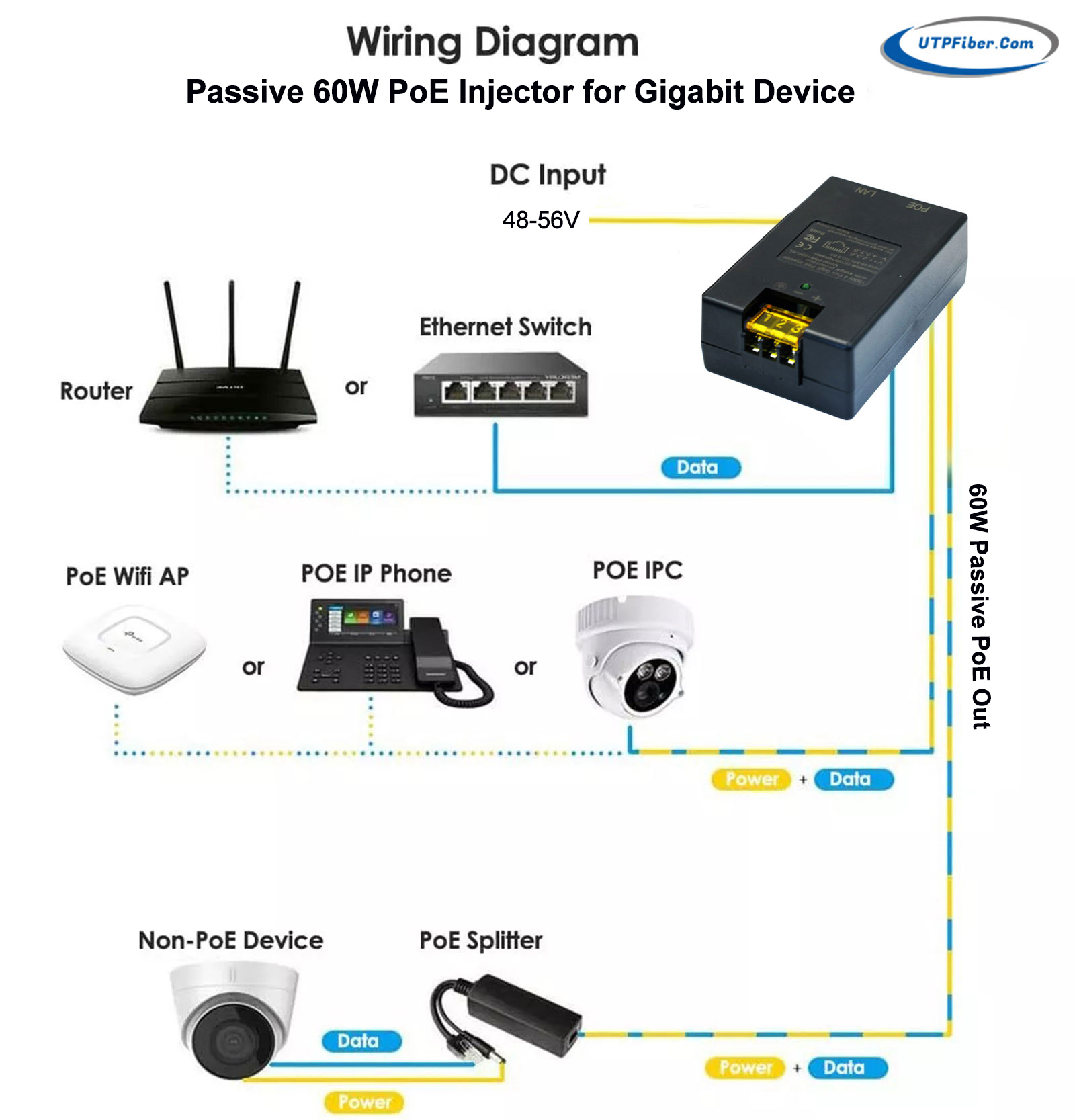 48-56DC Powered 10/100/1000Mbps 60W Passive POE Injector |