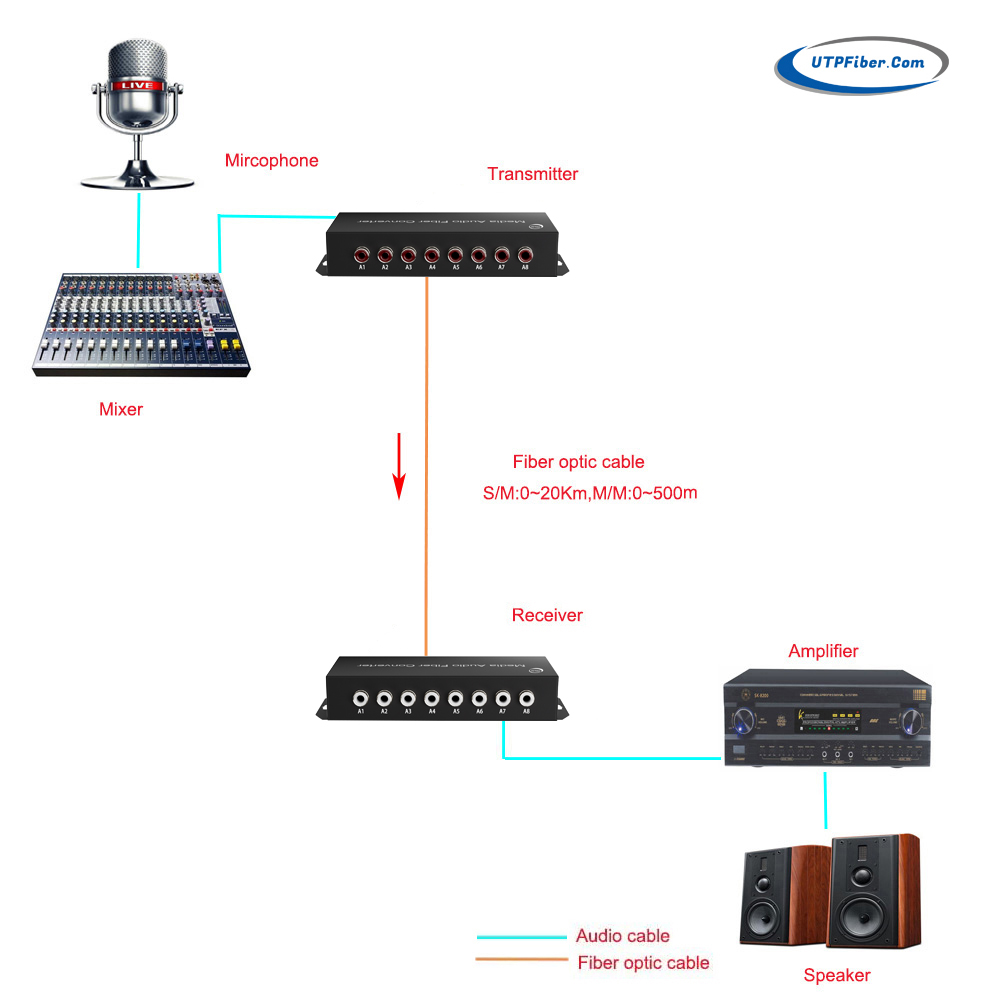 Each set consists of two units, one on the transmitter side, and one on the receiver side, that can be connected to an RCA analog stereo audio source and RCA stereo audio speakers or receiver, or 8-Channel separate mono RCA can be sent over the fiber independently.