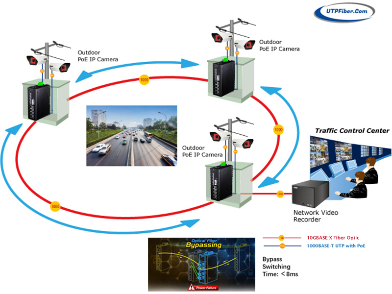 The UTP UF-MIS64X8GP-2BT-FBP is the highly reliable managed industrial Bypass PoE++ switch with 8-port 10/100/1000-T PoE, 4-port 1G/2.5G/10GBase-X SFP+ and 1 channel single fiber Bypass port. It complies with IEEE802.3af PoE, IEEE802.3at PoE+, IEEE802.3bt PoE++ standard protocol, the Max power output consumption per port can reach 90W (1-2 ports), which is the ideal solution for those high power consumption industrial networking PDs. In normal operation, it is a L2+ managed PoE++ switch. It supports ERPS redundant network and the self-recovery mechanism less than 20ms on full load which allows you to scheme a reliable Ethernet network by building a redundant ring topology as your back-up solution. IPv4/IPv6 static routing, DHCP server, robust Layer 2 management and secure functions can help users expand their networks quickly and efficiently. However, when it encounters a power failure or internal malfunction, the bypass function is activated through the integrated bypass optical switching module, which allows the network connections passing through the switch to remain uninterrupted, ensuring that the data can still flow directly between the connected devices, as if the switch were not in the path at all.