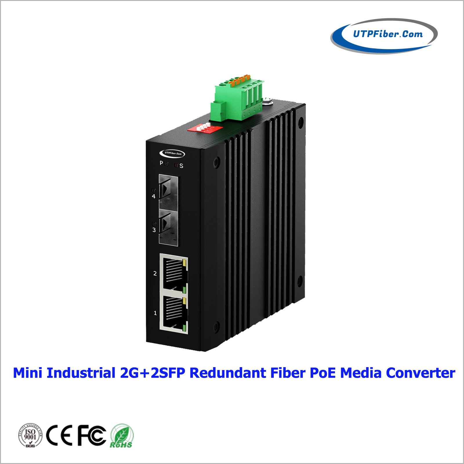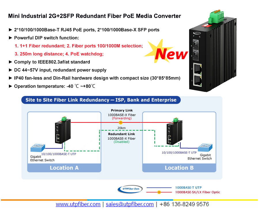Unmanaged Mini Industrial Redundant Fiber PoE Media Converter with 2*10/100/1000Base-T PoE ports and 2*100/1000Base-X SFP slots, complies with IEEE802.3af, IEEE802.3at standard, DC44-57V, redundant dual power supply, Din-rail installation. Fiber port transmission distance depending on the SFP module; Operation temperature: -40℃~+80℃ |