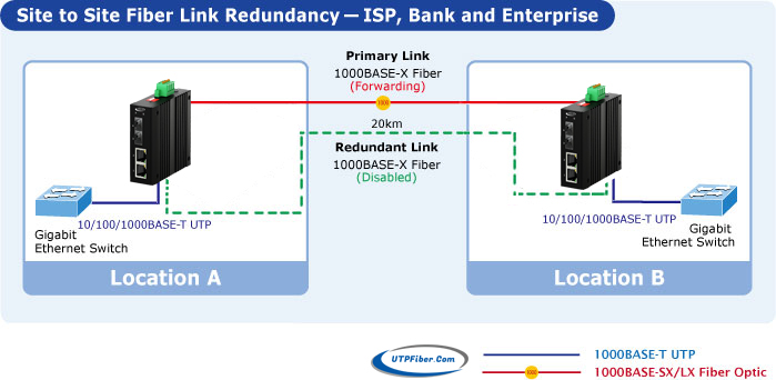 UF-IS6212GP can realize the optical line 1 + 1 redundancy protection in point-to-point mode via the DIP switch, it can provide Optical Port automatic protection switching. Via the DIP switch, the UF-IS6212GP can be configured as 2-port redundant media converter. When in the 2-port redundant mode, it provides rapid fiber redundancy of link for highly critical Ethernet applications. The redundant mode also supports auto-recovering function. If the destination port of a packet is link-down, it will forward the packet to the other port of the backup pair.