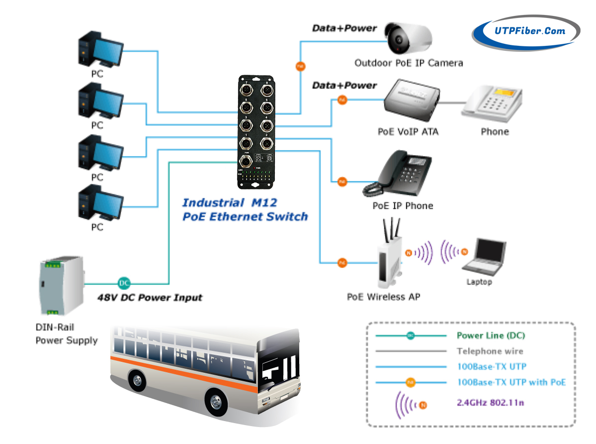 UTP UF-IES008P-M12 is an industrial-grade robust and vibration-proof PoE+ switch for a wide range of applications in factories or moving trains as it guarantees a reliable performance under vibration and shock. It features eight 10/100BASE-TX auto-negotiation waterproof/dustproof M12 connectors with IEEE 802.3at PoE+ injector function; each PoE+ port provides 30 watts of PoE output. The M12 connector provides tight and strong connection, and ensures stable Ethernet operating performance withstanding humidity, dirt, dust, shock, vibrations, heat and cold. The compact, IP40-rated aluminum case of the UF-IES008P-M12 allows wall mounting for efficient use of cabinet space.