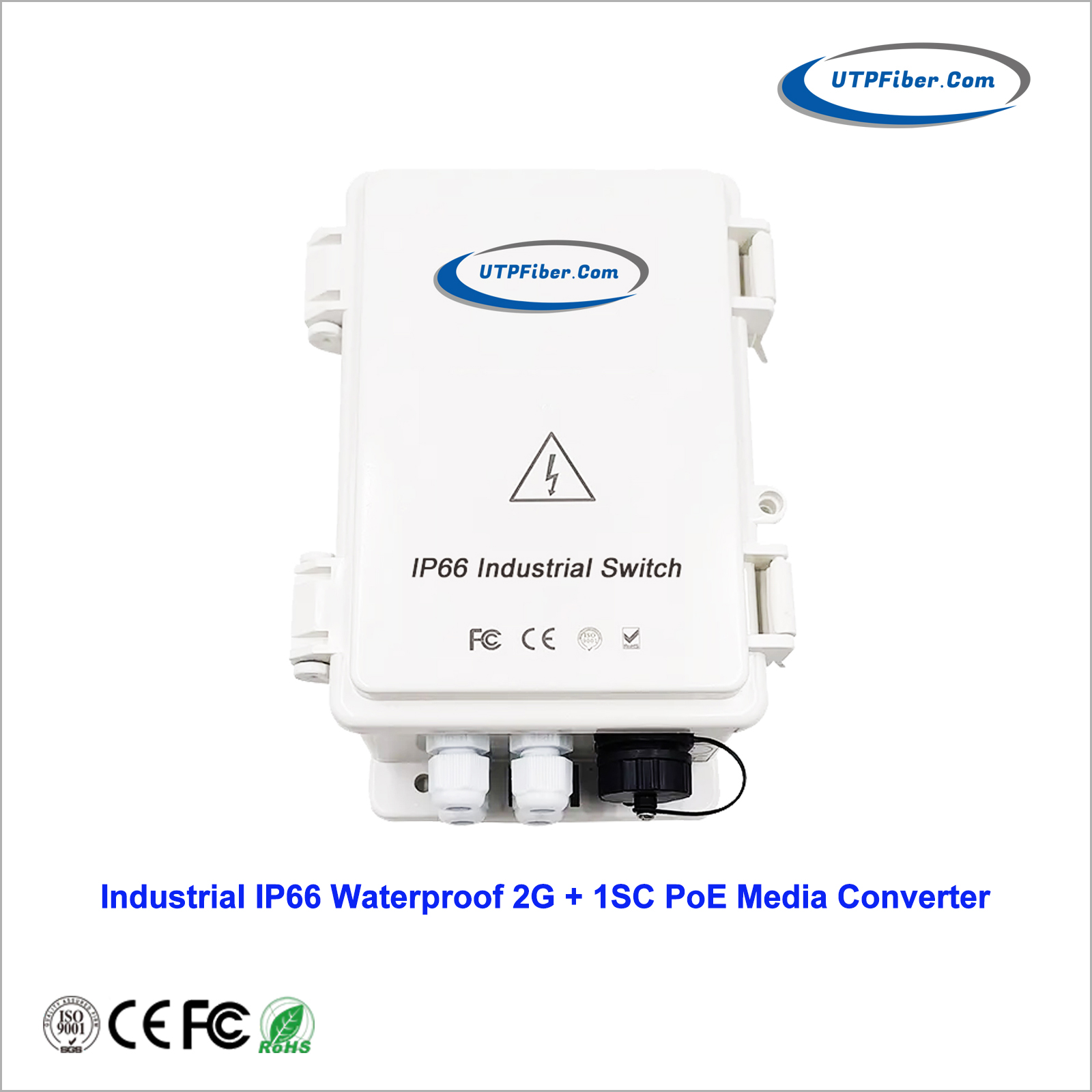 Industrial IP66 Waterproof 1-Port 1000BASE-X SC to 2-Port 10/100/1000T 802.3at PoE+ Media Converter, 1550nm TX/1310nm RX, Single Mode, Single Fiber SC 20KM |