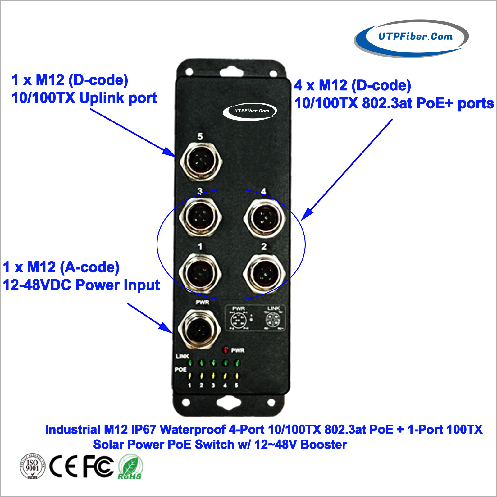 Industrial M12 IP67 Waterproof 4-Port 10/100TX 802.3at PoE + 1-Port 100TX Solar Power PoE Switch w/ 12~48V Booster, M12 Connector (D-Coded); -40° to 80°C |