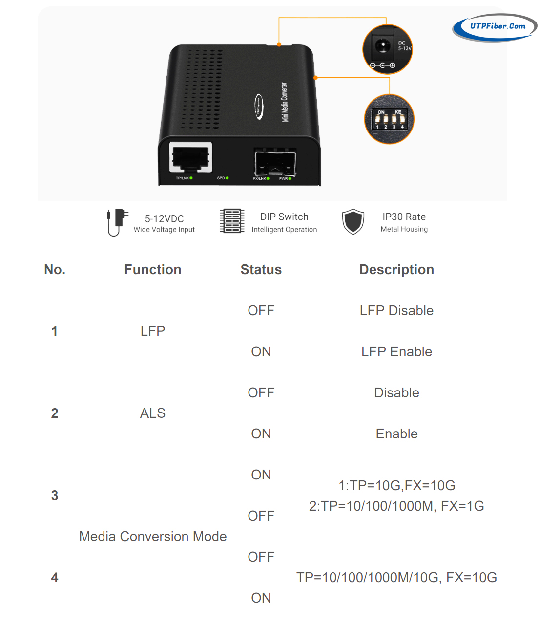 DIP 1: LFP function DIP 2: ALS function DIP 3: Working mode switching:rate following mode/Rate matching mode TP=10G, FX=10G. |