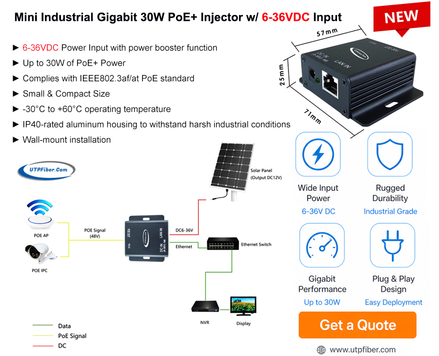 The UF-INJ30G is a high-performance PoE injector designed to seamlessly integrate network data and DC power into a single PoE output signal. It supports a wide input range of 6–36V DC and provides a stable 48V/0.65A output with a maximum power capacity of 30W. Featuring adaptive 10/100/1000 Mbps transmission and utilizing the RJ12+ / RJ36- power supply method, the unit ensures reliable, high-speed connectivity. It is built with comprehensive safety features—including protection against overvoltage, overcurrent, overheating, and short-circuits—and fully complies with IEC 61000-4-2/3/4/5/6 EMC standards, holding CE, FCC, and RoHS certifications.