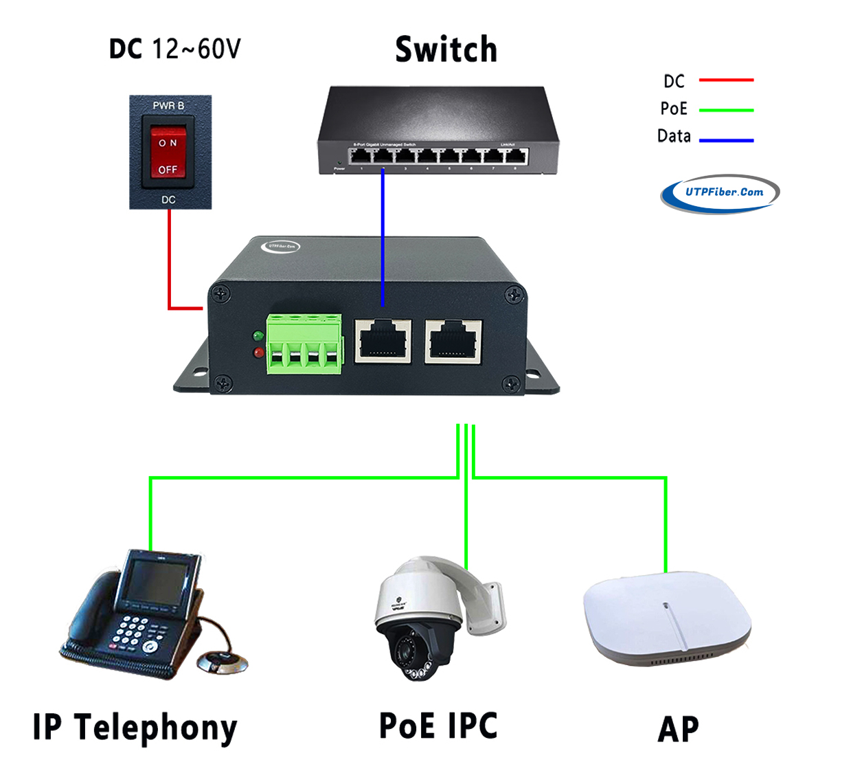 ► Injects 48V DC through a CAT 5 cable, use all 2 pairs into remote devices such as wireless AP, IP phone, web camera and other functions